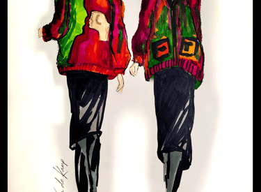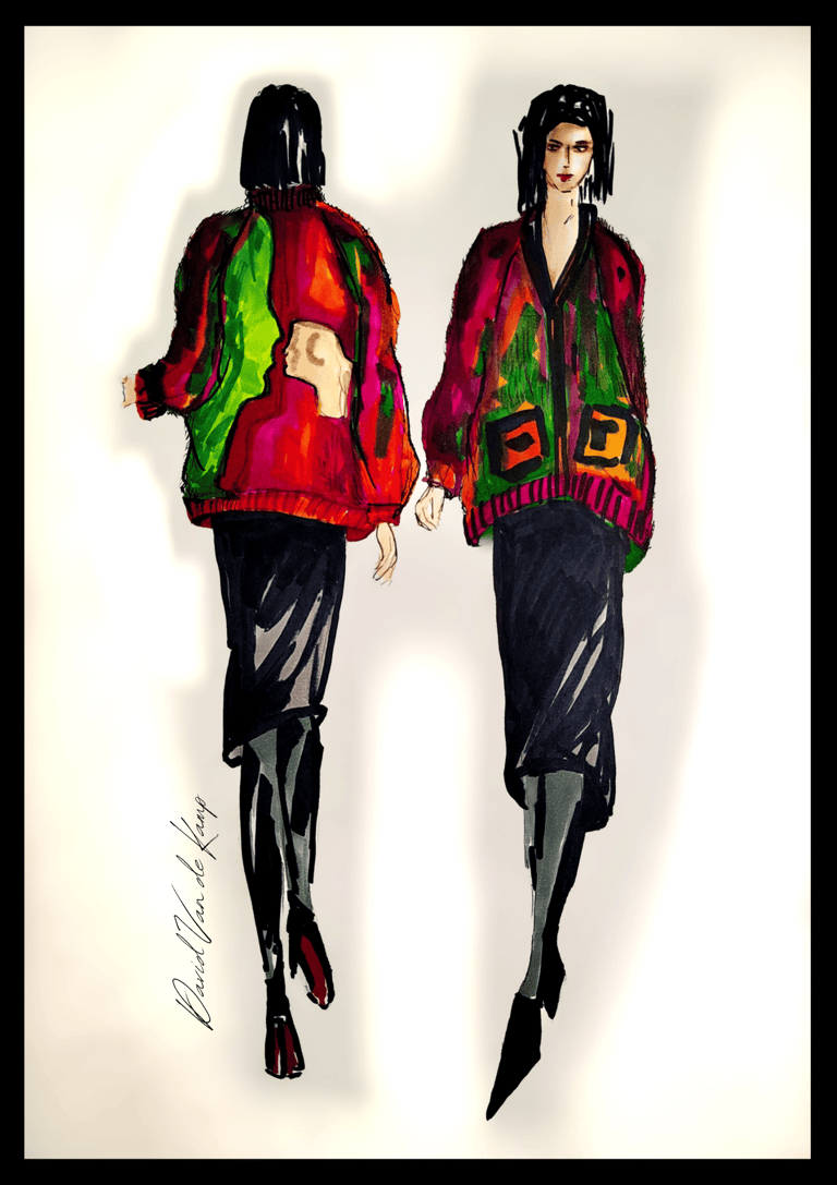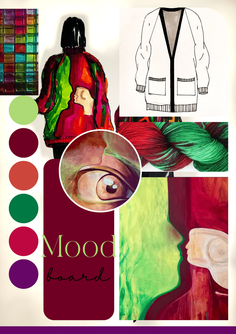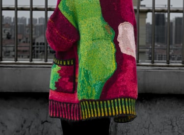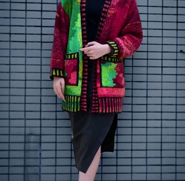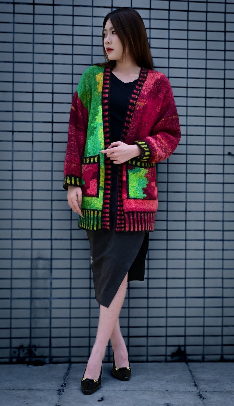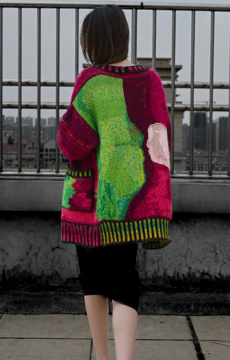 I made this cardigan in pieces using intarsia techniques and cashmere/brushed alpaca blend. There are over 50 colour combinations used to achieve this design.