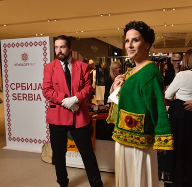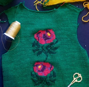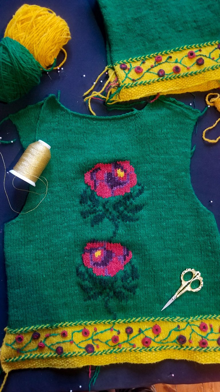 I designed and knitted this piece as part of my heritage collection. Jacket was made for the first lady of Serbia and inspired by Serbian rose kilim carpets. I used hand dyed wool from our native sheep breeds. The jacket features a large rose on the back and pockets worked in intarsia as well as embroidery details on the hem and cuffs.
